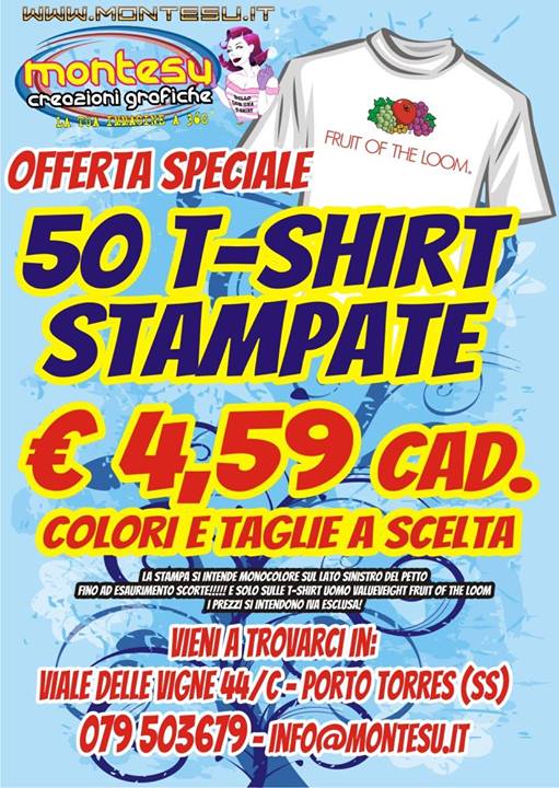 Promo T-shirt! da admin | Apr 8, 2014 | Promozioni Offera speciale 50 T-shirt stampate € 4,50 cad. Colore e Taglia a scelta!!!